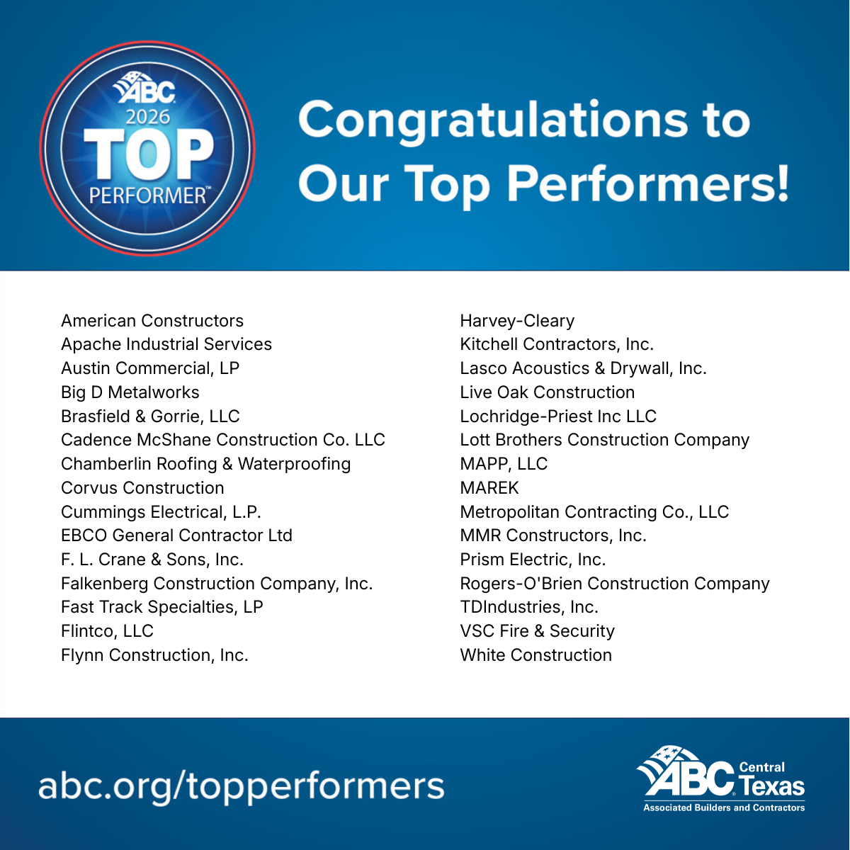 The ABC Central Texas 2026 Top Performer member companies include American Constructors, Apache Industrial, Austin Commercial, Big D Metalworks, Brasfield and Gorrie LLC, Cadence McShane Construction Company, Chamberlin Roofing and Waterproofing, Corvus Construction Company Inc., Cummings Electrical, EBCO General Contractor, FL Crane and Sons, Falkenberg Construction, Fast Track Specialties LP, Flintco LLC, Flynn Construction Inc., Harvey Cleary, Kitchell, Lasco Acoustics Drywall Plaster and Stone, Live Oak Drywall and Acoustical Systems Inc. and Live Oak Construction, Lochridge Priest Inc., Lott Brothers Construction Company, MAPP LLC, MAREK, Metropolitan Contracting Company LLC, MMR Constructors Inc., Prism Electric, Rogers O’Brien Construction, TDIndustries Inc., VSC Fire and Security Inc., and White Construction.